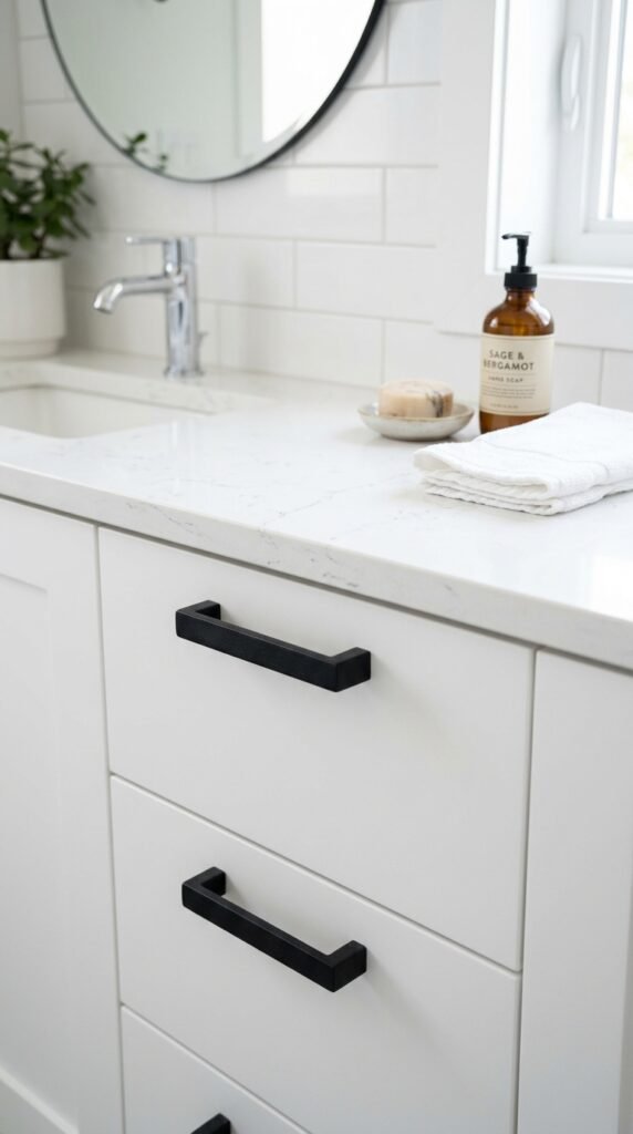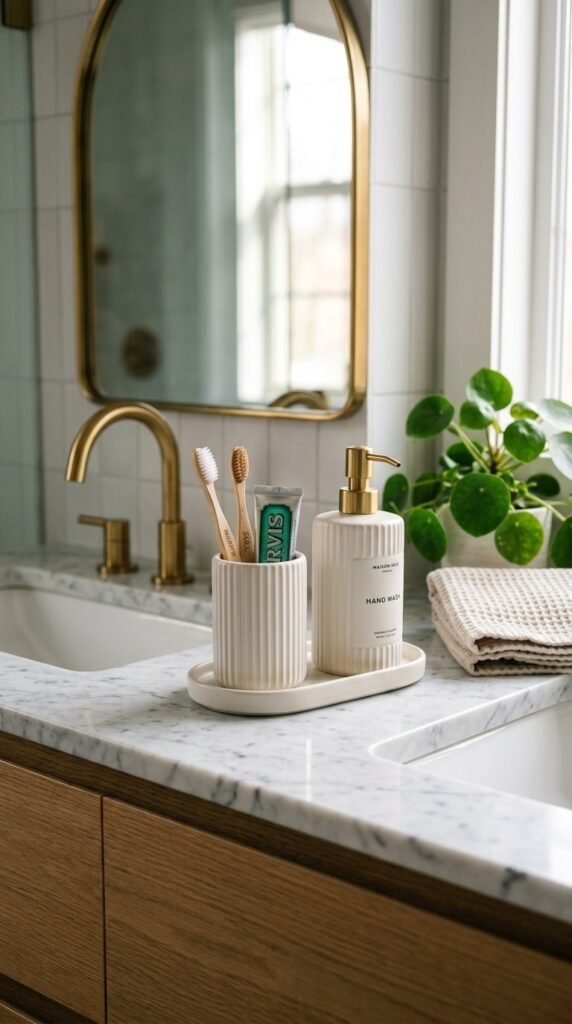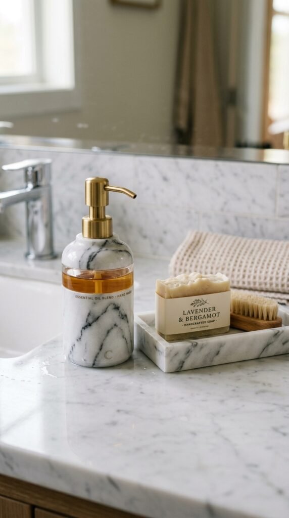 Upgrade small details with marble soap and lotion dispensers. They’re affordable, stylish, and add cohesion to the marble theme. Even if your main surfaces aren’t real marble, these accessories maintain a polished, unified look.