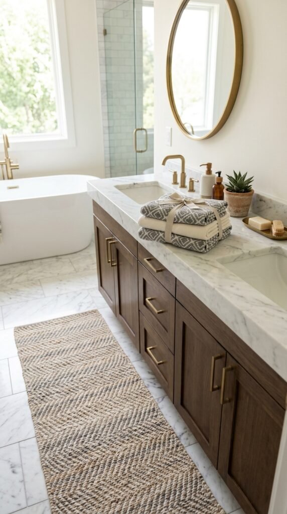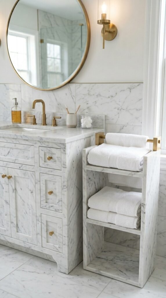 Pair marble surfaces with soft textiles like towels, rugs, or shower curtains. The contrast between smooth marble and cozy fabrics softens the room. This is an easy, low-cost way to keep the bathroom inviting and luxurious without large renovations.