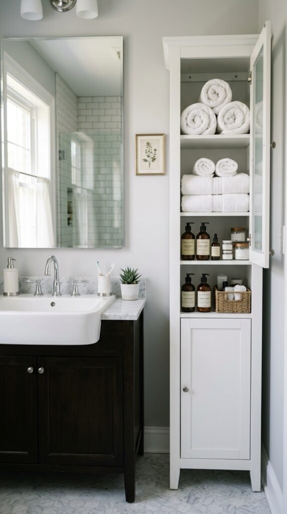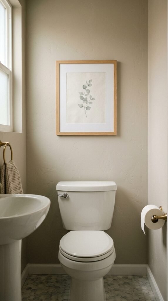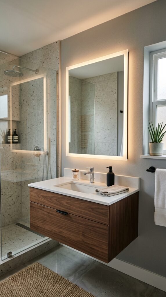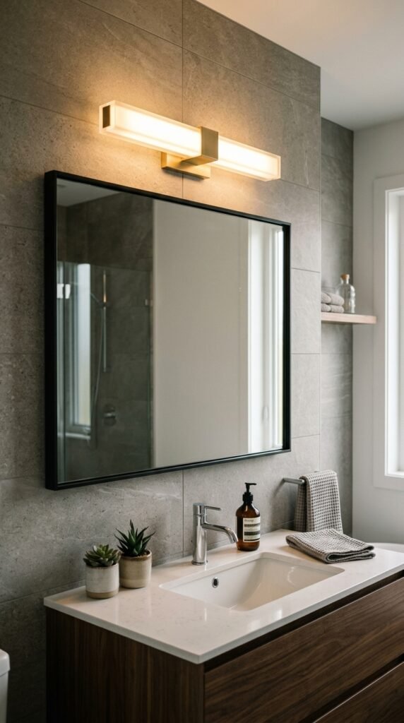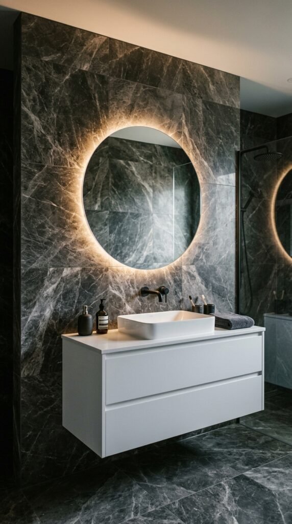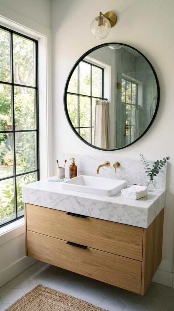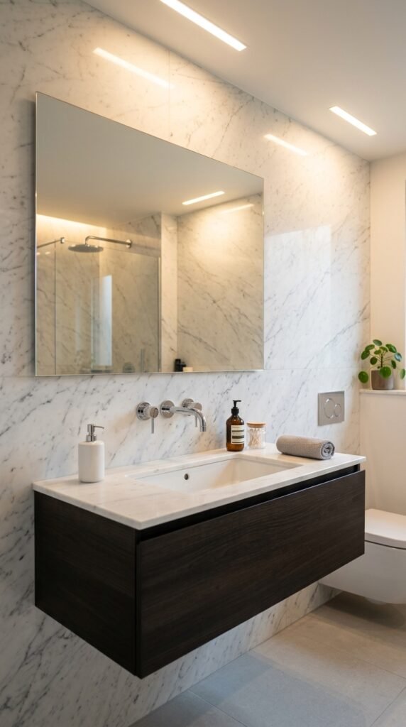 A marble-framed mirror adds elegance without replacing your vanity. Use adhesive marble sheets for a DIY frame upgrade. Mirrors reflect light, enhancing marble’s brightness. Choose a simple frame to maintain a clean, timeless look that complements your bathroom’s overall aesthetic.