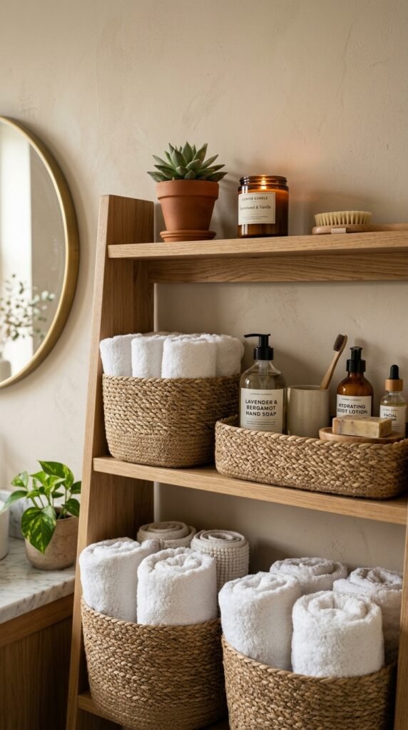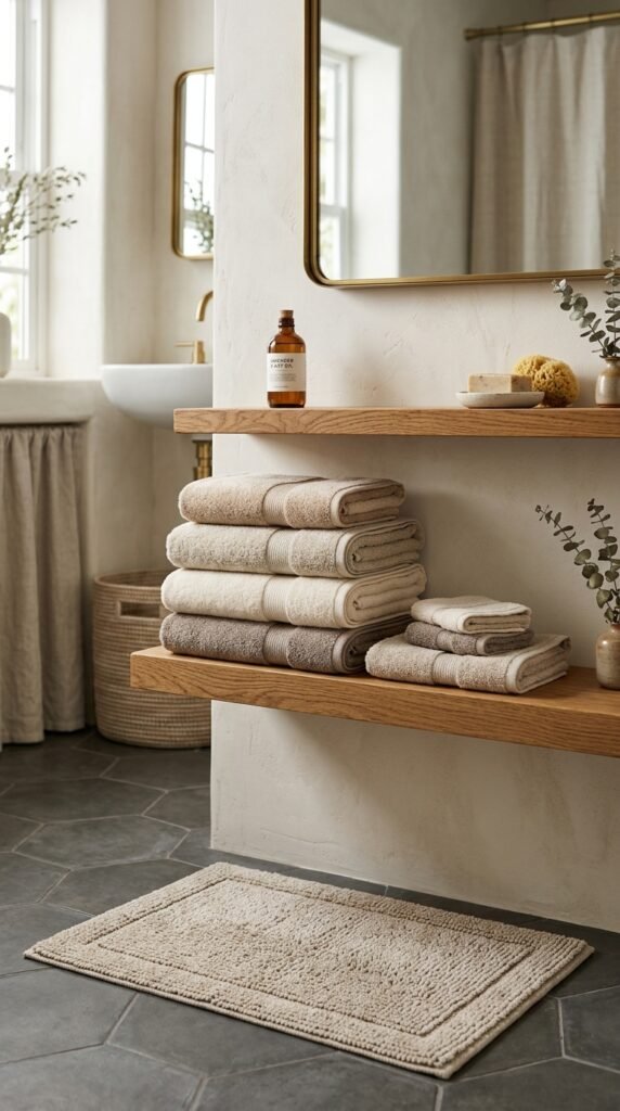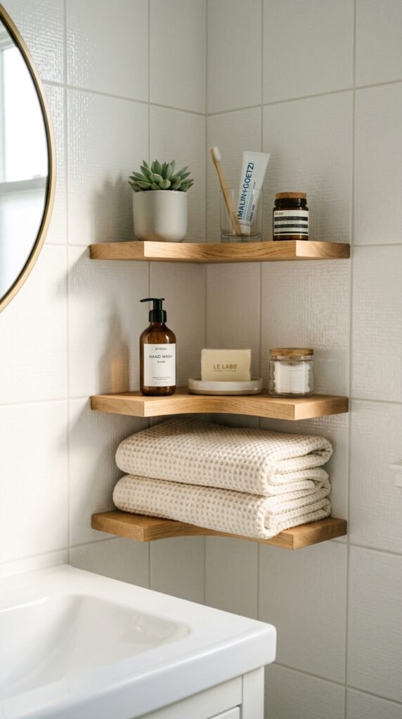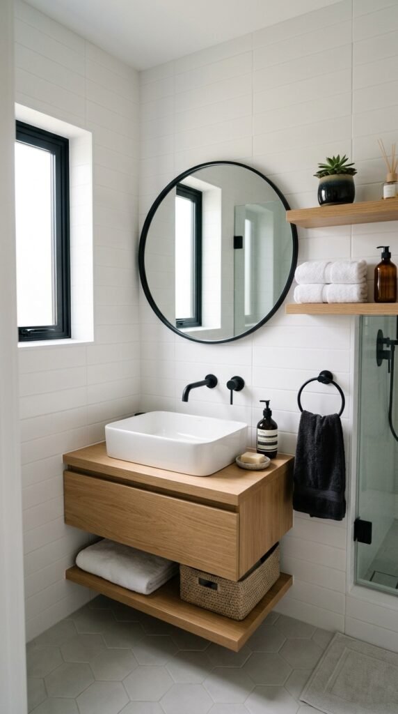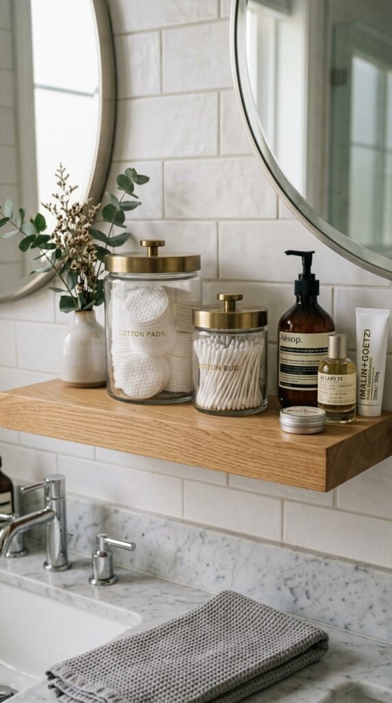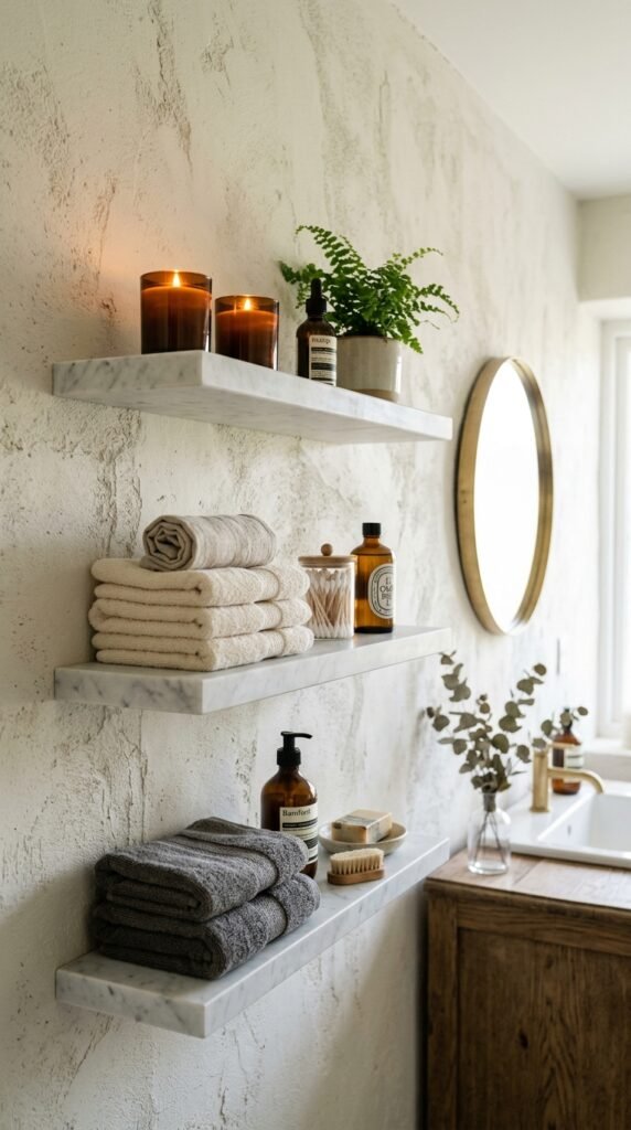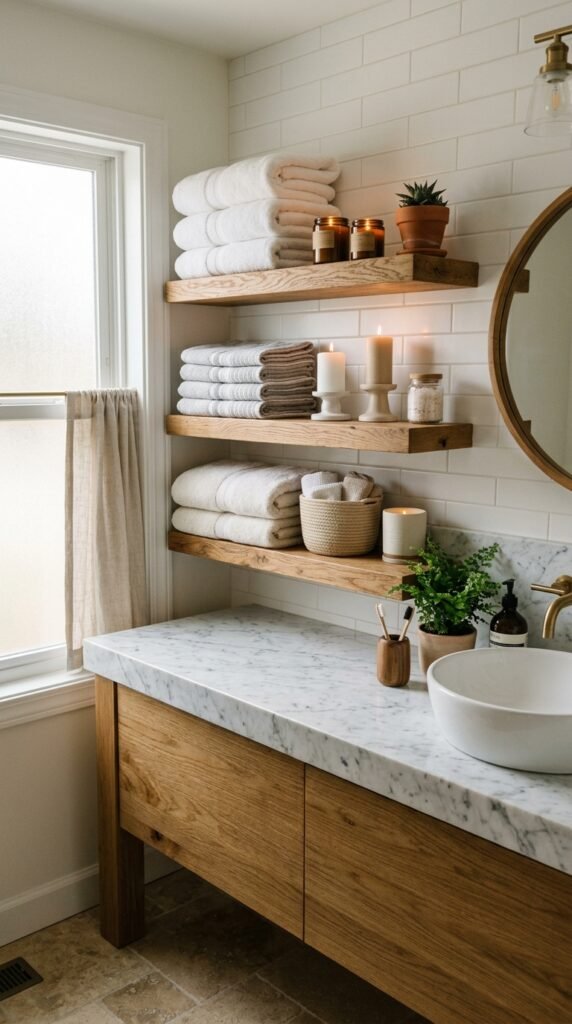 Pairing a marble countertop with floating wooden shelves combines elegance and practicality. Shelves offer storage without bulky cabinetry. This is easy to install and gives the bathroom an open feel. For DIY, ready-made floating shelf kits are affordable and simple to assemble.