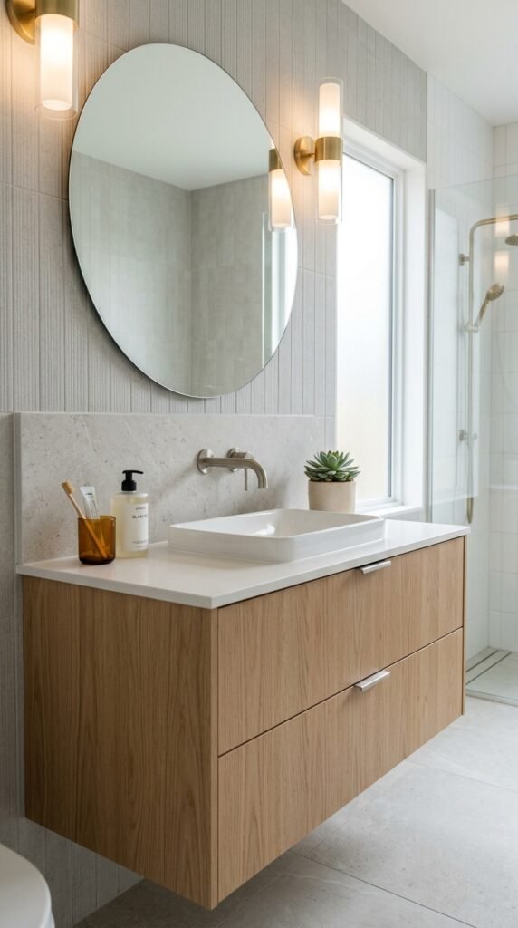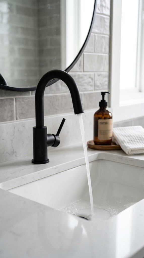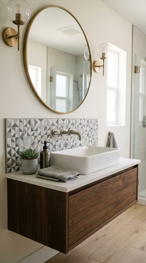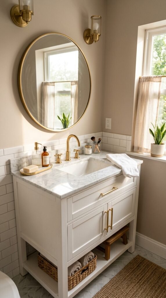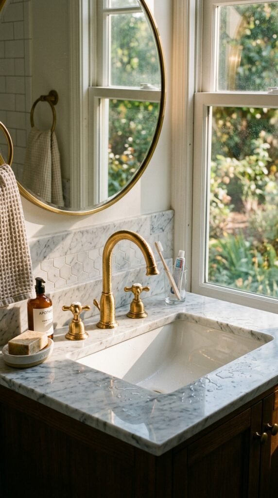 A marble backsplash adds subtle luxury. Even covering just 2–3 feet behind your sink elevates the space. Peel-and-stick tiles or small slabs can be installed quickly. This approach highlights your sink area while keeping the rest of the bathroom simple and budget-conscious.
