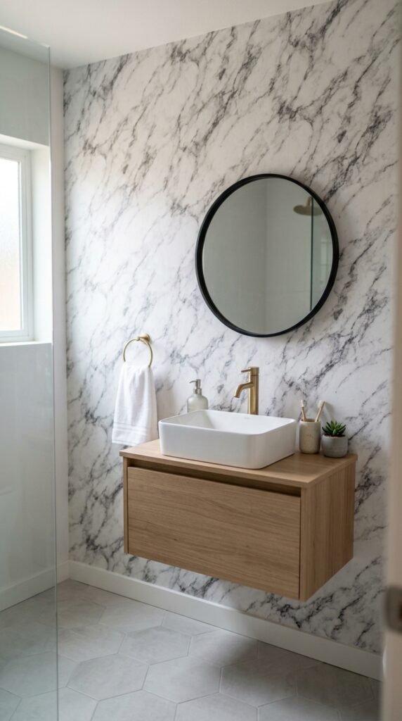 Marble-effect wallpaper is a fast, low-cost alternative to real marble. Ideal for accent walls or behind vanities, it brightens the space. Peel-and-stick options simplify installation. Pair with minimal fixtures to ensure the wall remains a feature rather than a distraction.