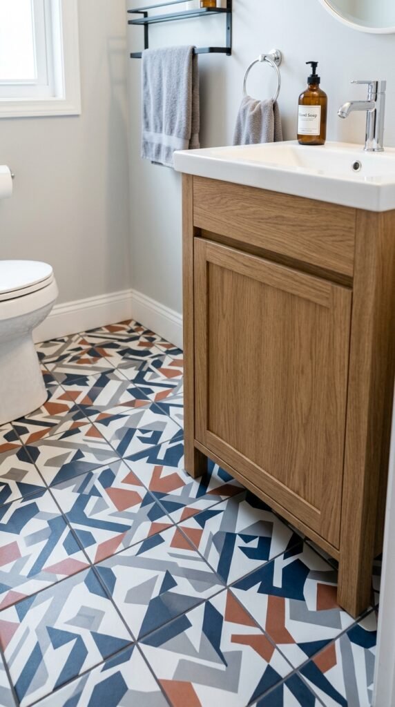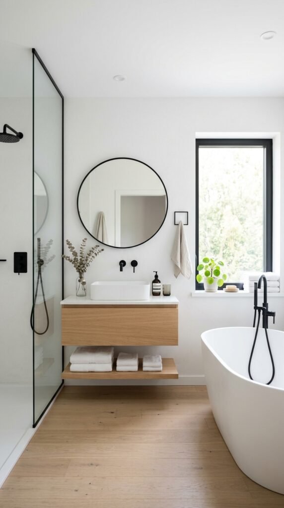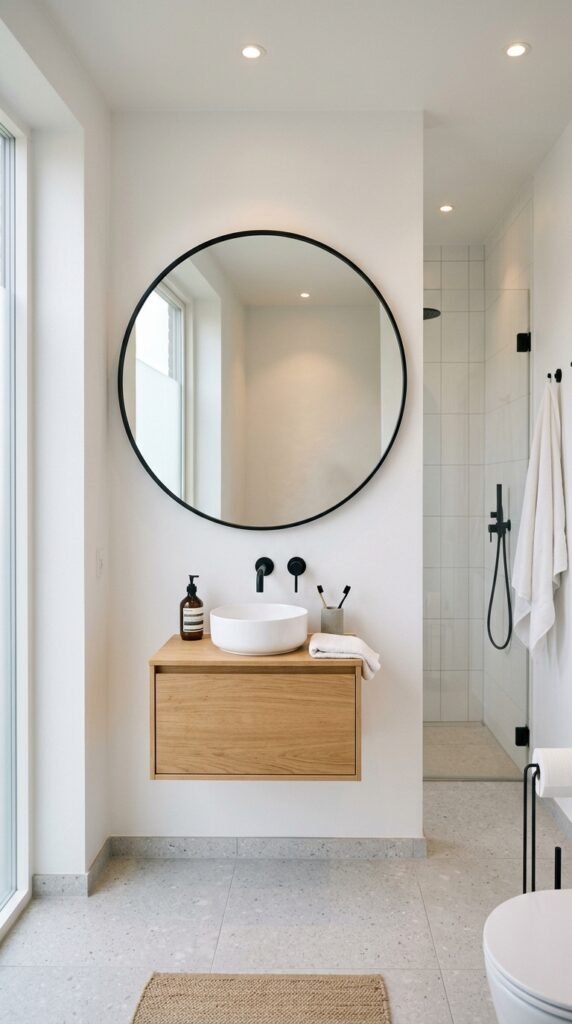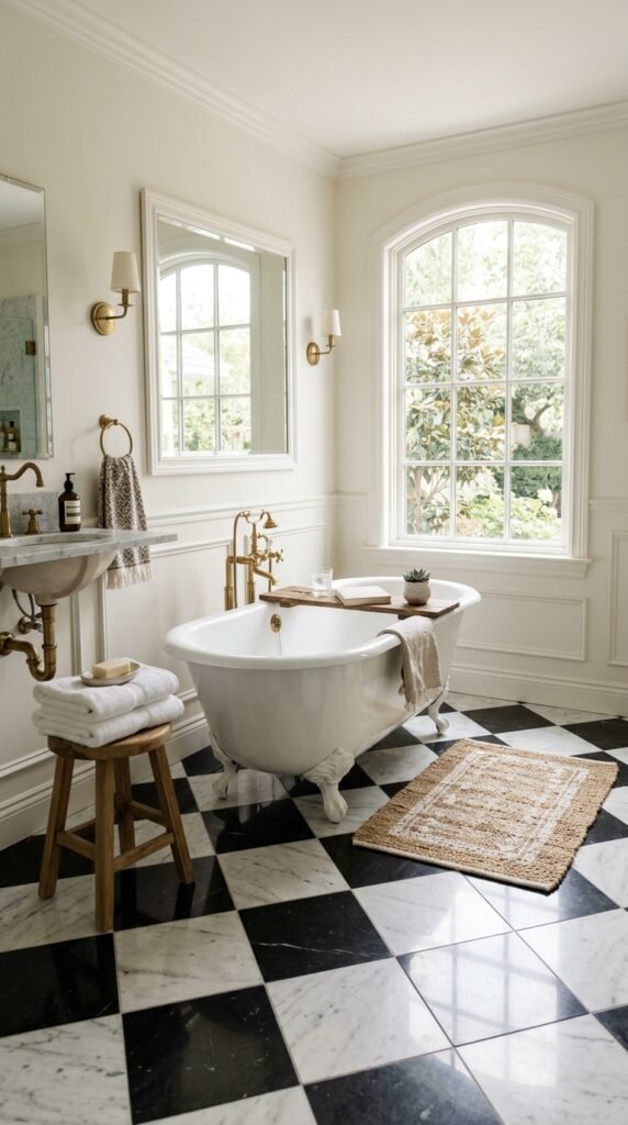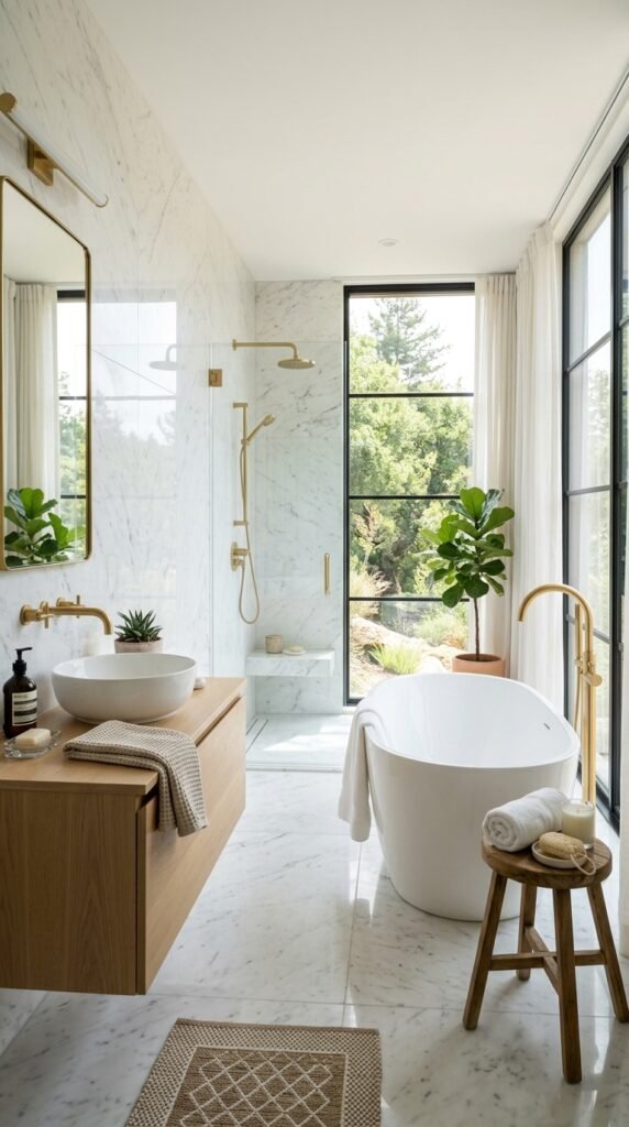 White marble floors make the bathroom feel larger and cleaner. Combine them with warm wood accents like stools, shelves, or small mats to add texture. Even inexpensive bamboo mats can provide that cozy touch. Marble tiles with light gray veins hide minor water spots, while wooden accessories prevent the space from feeling cold or sterile. This mix creates a balanced, inviting look.