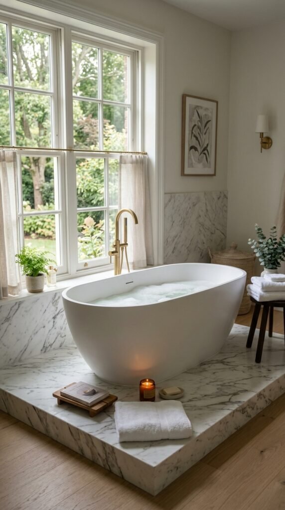 A freestanding tub on a marble platform creates a spa-like vibe. You don’t need a full renovation; a marble-effect pedestal or tiles under your existing tub works wonders. Add a bath caddy or simple candles to enhance relaxation. This setup highlights the elegance of marble while keeping the room uncluttered and stylish.