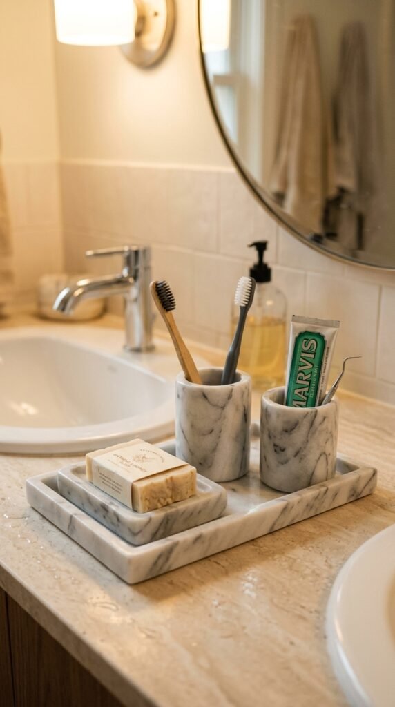 Small marble accessories instantly lift your space. Soap dishes, trays, or containers provide cohesion without major renovations. These items are affordable and easy to replace if you want a seasonal refresh. Their subtle elegance complements larger marble features in the room.