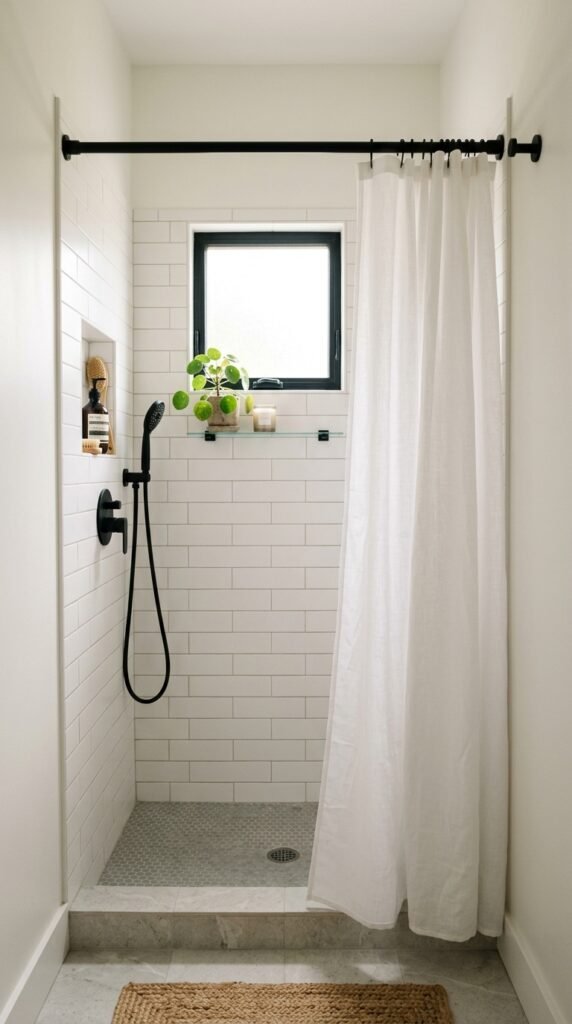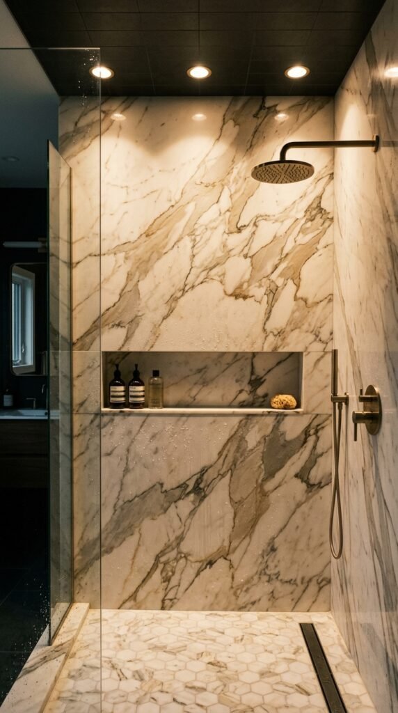 Incorporating a marble shower niche gives both style and storage. If full marble walls aren’t feasible, this small accent can make a big impact. Use it for soaps, candles, or plants. For DIY-friendly options, marble tile sheets can line the niche, giving a high-end look without a large expense.