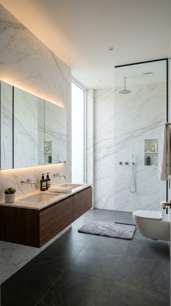 Focusing on a single accent wall lets you enjoy marble’s beauty without overwhelming your budget. Place it behind the tub or vanity for maximum impact. Keep other walls plain or painted white to maintain brightness. Small décor items like plants or candles complement this setup.