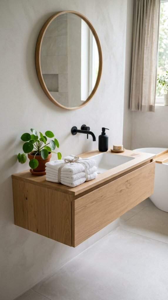 Small touches like matching soap dispensers or folded white towels add a calm spa feeling.
