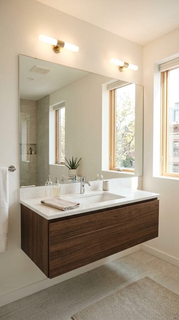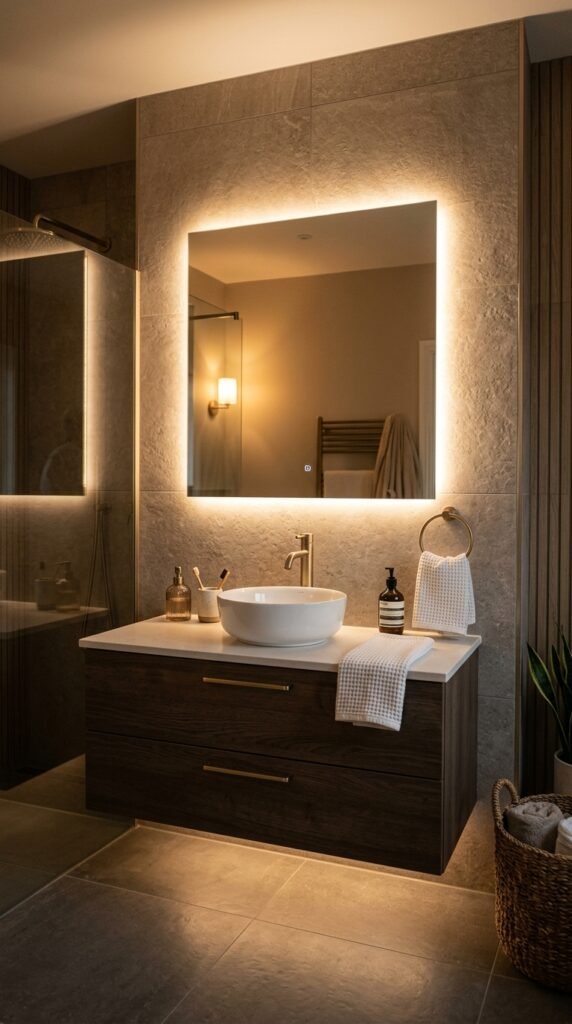 Add soft LED lighting around the mirror edges. This improves visibility while creating a calm atmosphere.