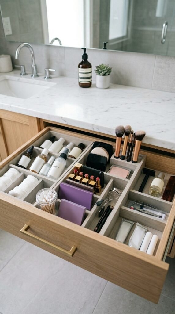 A simple DIY step is replacing bulky hardware with sleek matte black or brushed metal handles. Small details make the vanity feel modern.