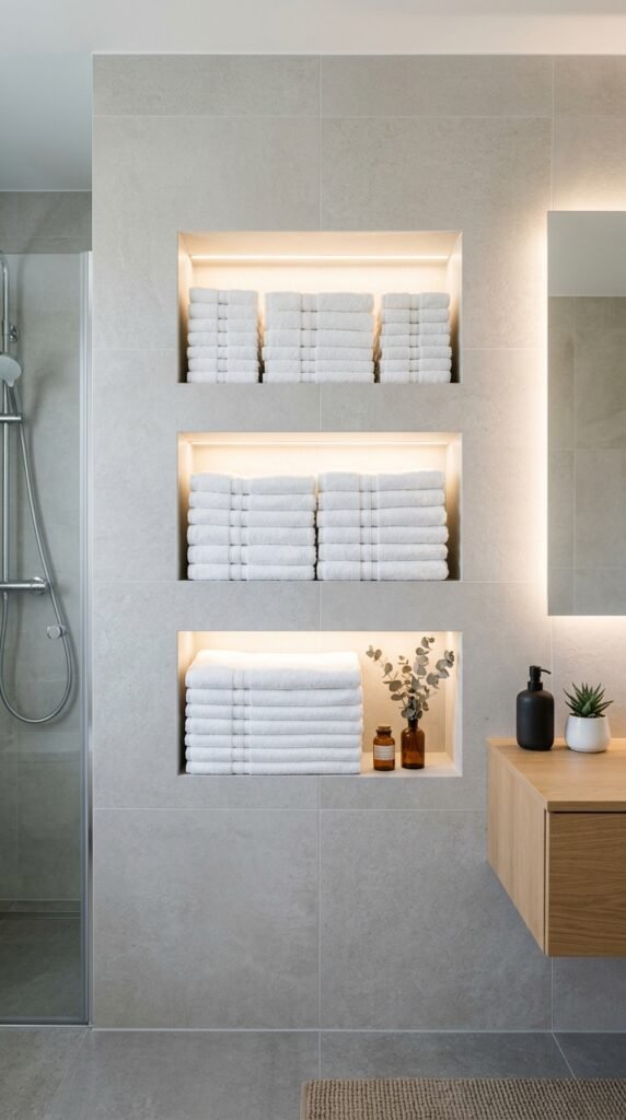 Built-in shelves keep towels organized while saving cabinet space.