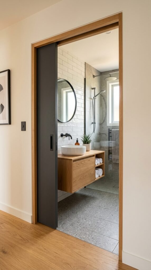 Many homeowners install sliding barn-style doors for a simpler alternative.