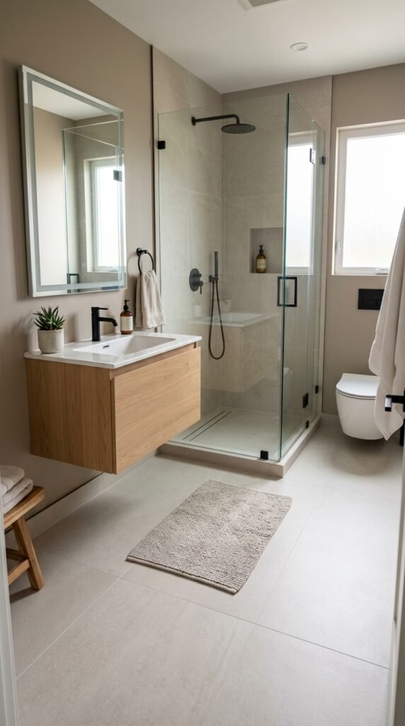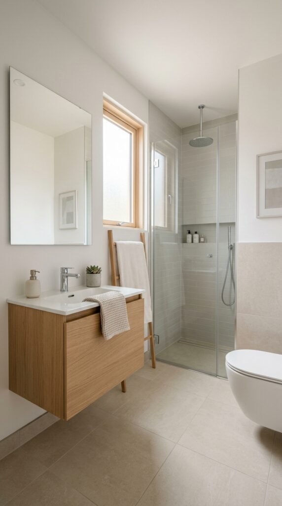 Neutral colors make small bathrooms feel calm and open.