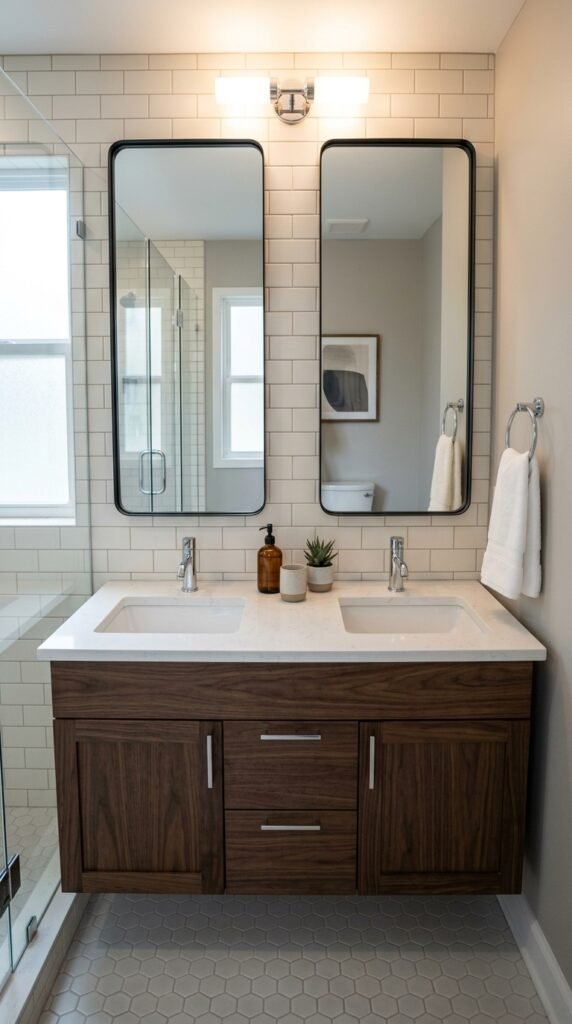 If the bathroom width is limited, consider a floating double vanity. It keeps the floor visible and the room open.