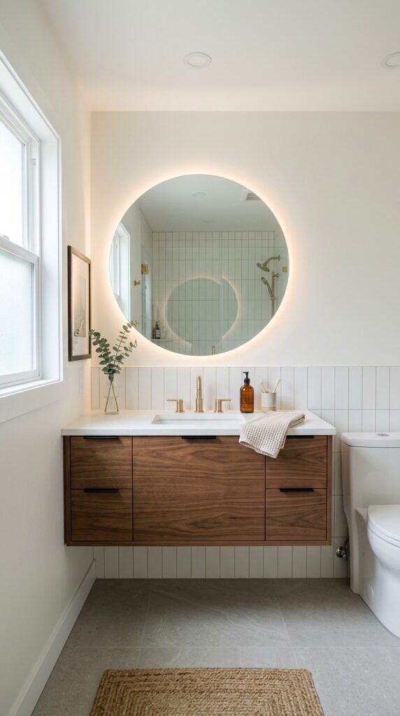 Lighting also matters here. A round mirror above the vanity reflects more light around the room. Wall sconces on both sides create balanced lighting for daily routines.