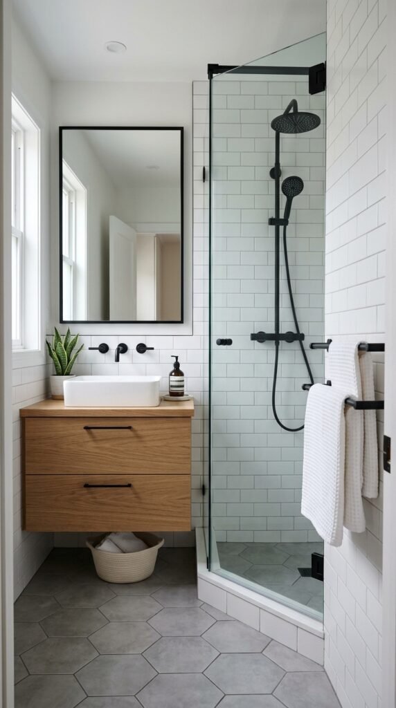 Matte black fixtures bring a modern touch to any small bathroom.