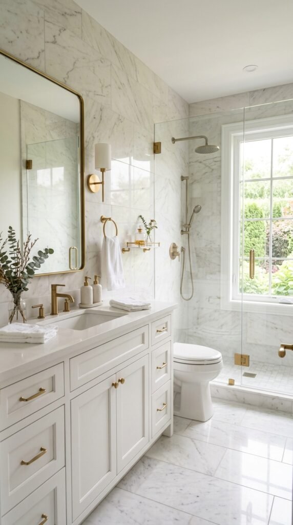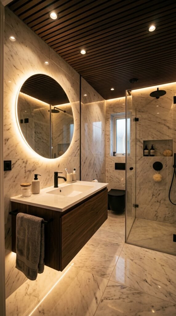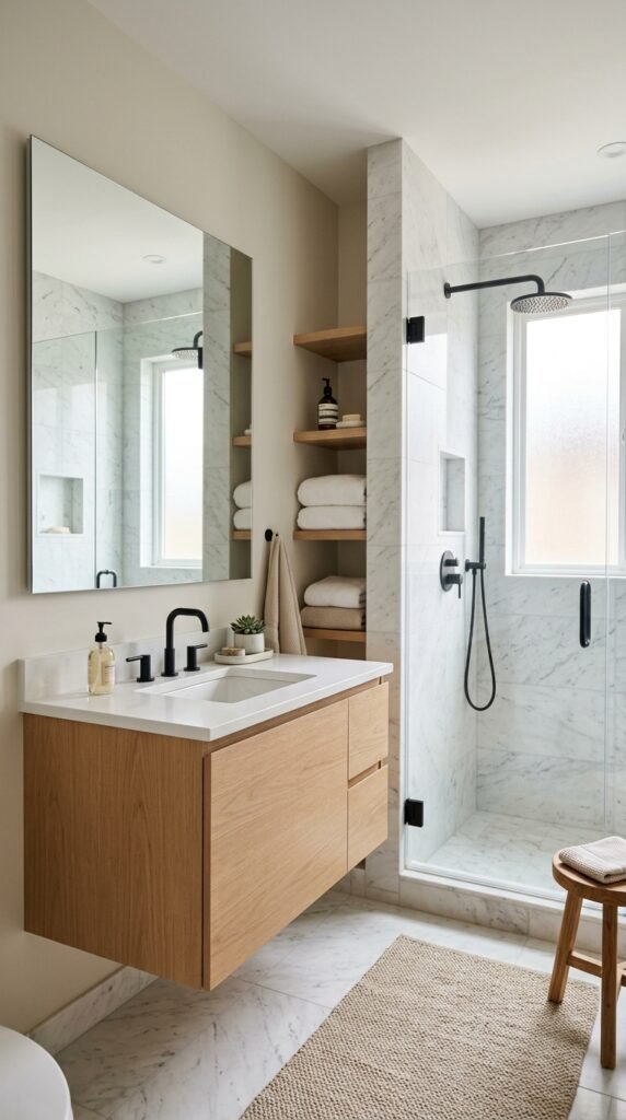 For a budget-friendly update, consider marble-pattern peel-and-stick wall panels behind the vanity. They add texture without full renovation work.