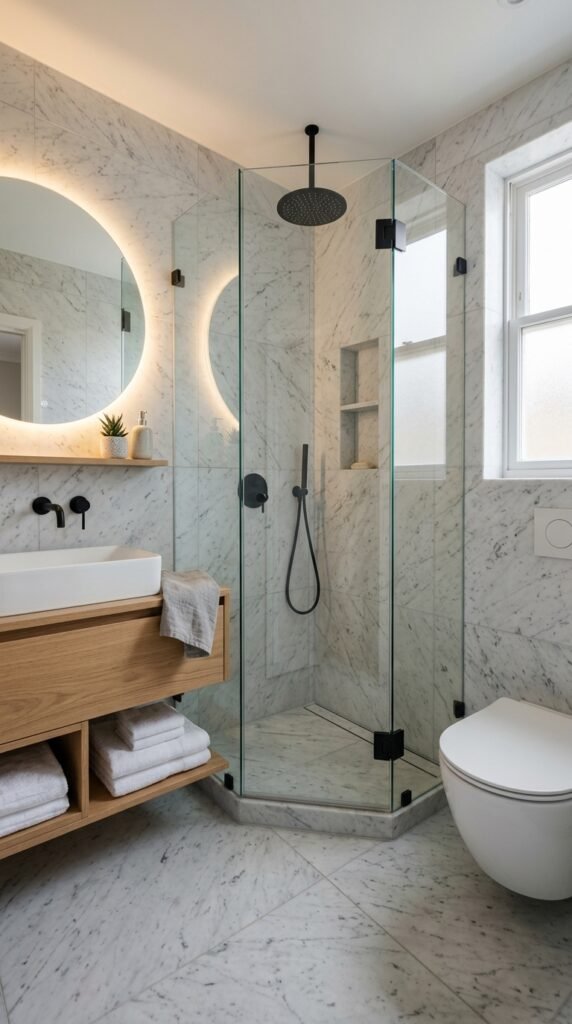 Good lighting improves both function and style in a compact bathroom.
