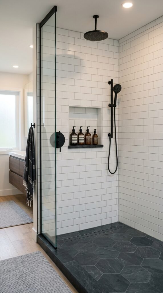 A shower niche is one of the most useful additions. It keeps soap and shampoo within reach without hanging caddies.