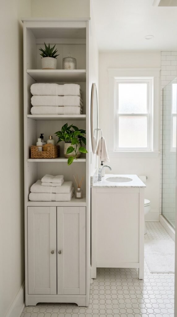 DIY builders often convert narrow bookcases into bathroom storage by adding moisture-resistant paint.