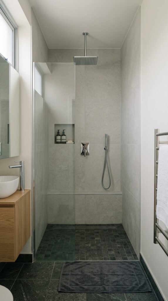 Use large tiles inside the shower so the design flows across the room. Matching floor and shower tiles make the space appear longer.