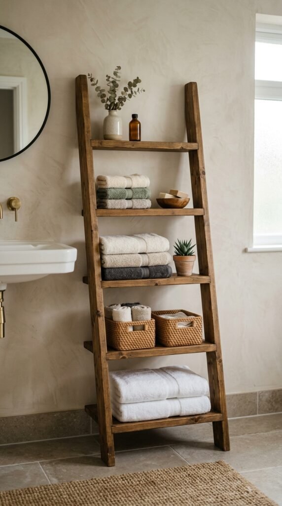 A ladder shelf adds storage without heavy cabinets.
