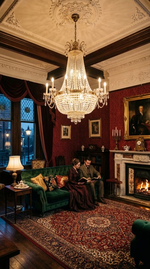 Lighting creates mood. Look for antique-style chandeliers or wall sconces with crystal or brass details. Affordable replicas work just as well. Place a chandelier above the main seating area or use sconces for subtle ambiance. Pair with warm bulbs to soften the room. DIY tip: spray-paint older fixtures in metallic tones to refresh them. Proper lighting instantly enhances the Victorian atmosphere.