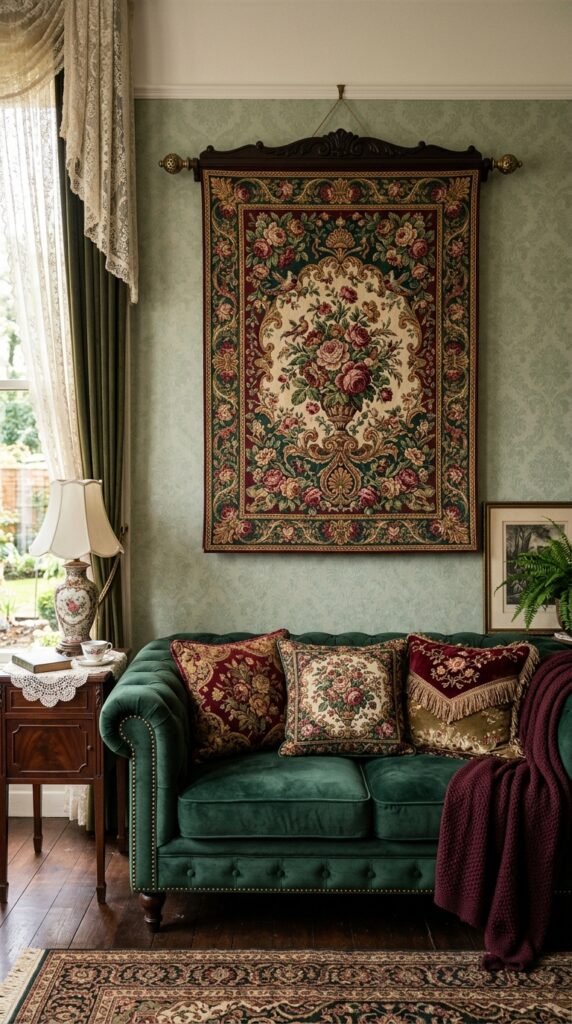 Tapestries add texture and color. Look for affordable vintage-style or reproduction tapestries. Hang above sofas or mantels as a centerpiece. DIY: frame smaller fabric pieces to create a gallery effect. Tapestries create warmth, soften walls, and bring traditional Victorian patterns into your living room on a budget.