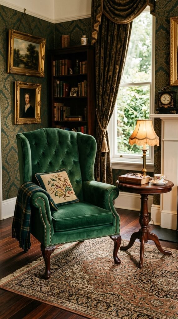 Wingback chairs are elegant and inviting. Look for thrifted or online second-hand options. Add a throw or pillow to match your décor. DIY: repaint wooden legs or reupholster in velvet for a fresh look. One statement chair can anchor the room and instantly bring Victorian style to your seating area.
