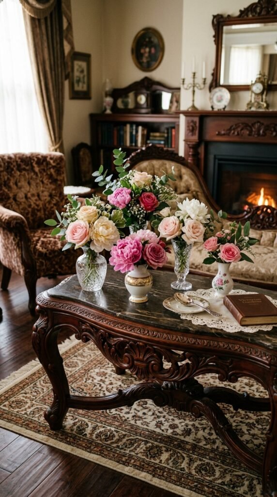 Fresh or artificial flowers bring life. Choose classic blooms like roses, peonies, or hydrangeas. Place in porcelain or brass vases for authenticity. DIY: use thrifted teacups or jars as unique flower holders. Even small arrangements on side tables or mantels add Victorian charm. Flowers soften interiors and make rooms feel welcoming.