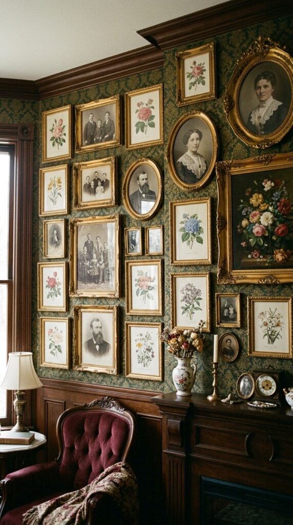 Artwork sets the tone. Hunt for vintage prints, old maps, or classic portraits. Thrift shops, flea markets, or print reproductions are budget-friendly. Use a gallery wall for visual impact or a single large frame above the mantel. DIY tip: repaint frames in gold or cream to match your décor. Layer small frames on shelves for a casual display. Vintage art adds personality while keeping the Victorian charm alive.