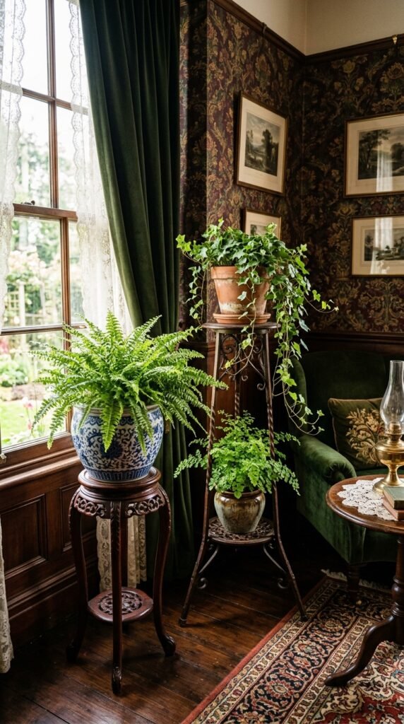 Plants soften interiors. Ferns, ivy, and palms suit Victorian aesthetics. Use decorative pots or stands to lift plants. DIY: repurpose teapots or antique tins as planters. Small greenery adds freshness and texture without cluttering the room. It’s a simple way to bring life into traditional interiors.
