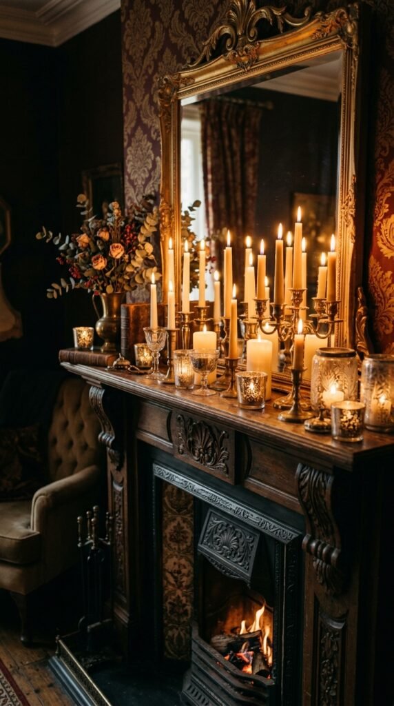 Candles add ambiance. Use clusters of varying heights in brass or glass holders. Mix with small décor items for layered effect. DIY: repurpose jars as candle holders and paint or embellish. Candles create soft light and warmth, perfect for evenings. Even a few strategically placed candles enhance Victorian sophistication.