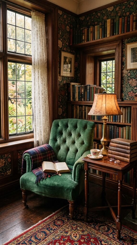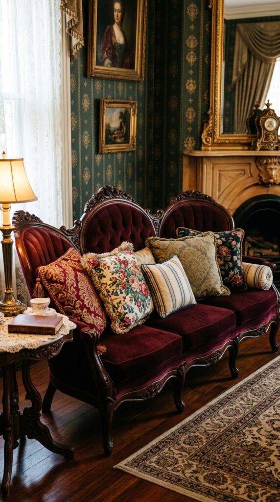 Velvet instantly adds luxury without major renovation. Look for second-hand shops or online marketplaces for affordable velvet chairs or sofas. Mix rich colors like deep green, burgundy, or navy to match classic Victorian palettes. Add throw pillows with floral or damask patterns for extra charm. Even a single velvet armchair can become the room’s focal point. For DIY, cover an old chair with velvet fabric using simple staples and cushions. Keep surrounding furniture minimal to let the plush texture shine. A floor lamp or small side table nearby completes the cozy corner.