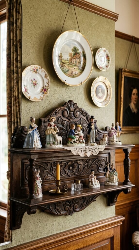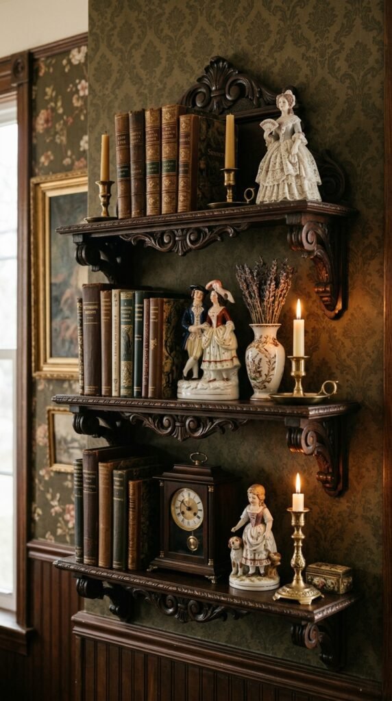 Shelving displays personality. Choose ornate brackets or carved wood shelves. Display books, collectibles, or plants. Mix heights for interest. DIY tip: paint simple shelves in antique white and add decorative brackets for Victorian flair. Shelves help organize while showing off style. Even budget-friendly options elevate the room instantly.