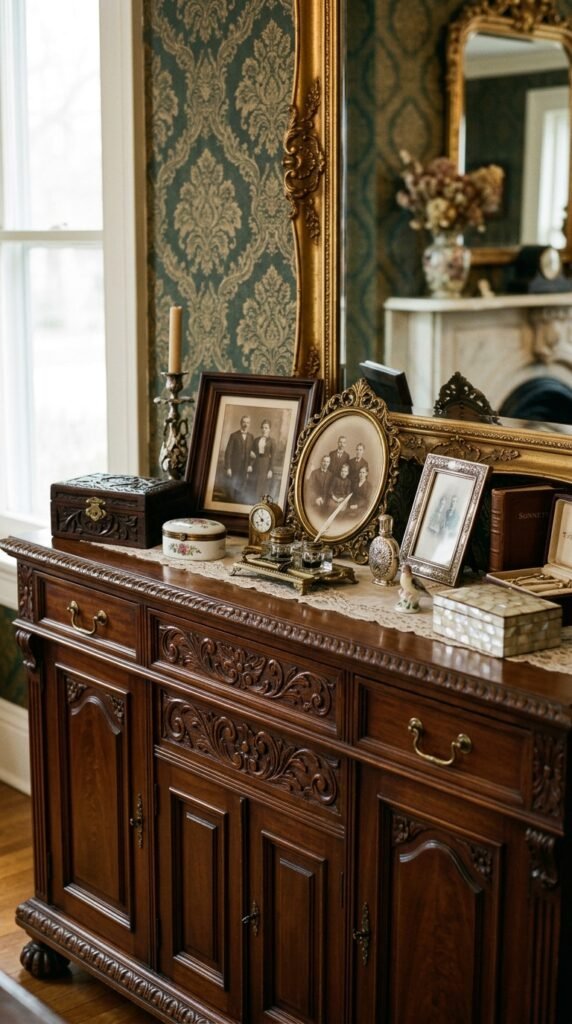 Show personality with curated items. Family photos, vintage trinkets, or heirlooms add warmth. Display on shelves, mantels, or tables. DIY: create a small display corner with frames or boxes. These touches make the room feel lived-in while keeping Victorian elegance. Personal items complete the space without major costs.
