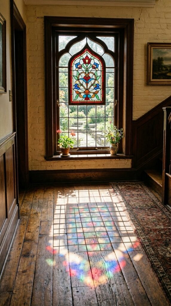 Stained glass adds character. Small panes or inserts are cheaper than full windows. Hang or place near light sources to catch the sun. DIY: use adhesive stained-glass film on existing windows. Even a single accent panel adds Victorian charm and color play, making the room feel historic and artistic.